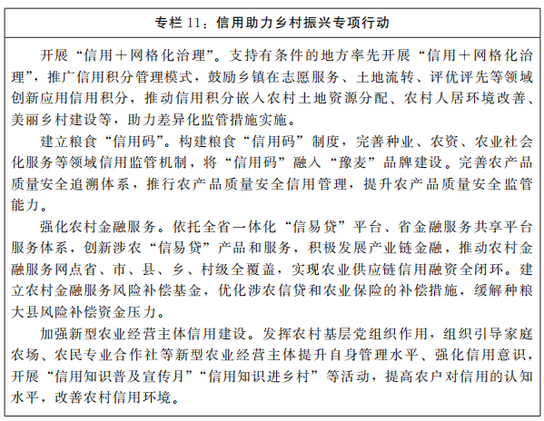 全面推進(jìn)“信用+鄉(xiāng)村治理”建設(shè),聚焦糧食安全、農(nóng)村金融、新型農(nóng)業(yè)經(jīng)營(yíng)主體監(jiān)管等領(lǐng)域,創(chuàng)新農(nóng)村信用應(yīng)用場(chǎng)景和管理模式。深化農(nóng)村金融服務(wù)改革,健全農(nóng)村金融服務(wù)體系。依據(jù)新型農(nóng)業(yè)經(jīng)營(yíng)主體發(fā)展目錄,圍繞信貸融資、行業(yè)監(jiān)管、風(fēng)險(xiǎn)防范、利益聯(lián)結(jié)等場(chǎng)景建立新型農(nóng)業(yè)經(jīng)營(yíng)主體信用評(píng)價(jià)體系。