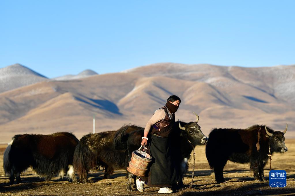 青海省玉樹(shù)藏族自治州稱(chēng)多縣珍秦鎮(zhèn)二村牧民扎西德藏準(zhǔn)備給牦牛擠奶(2020年10月28日攝)。新華社記者 張龍 攝
