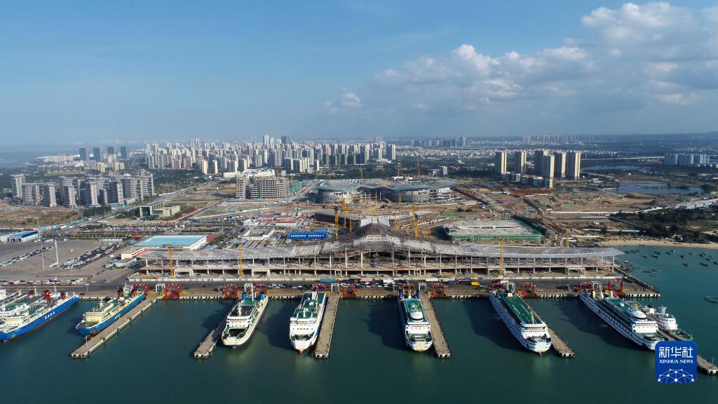這是2022年2月11日拍攝的??谛潞8劭瓦\綜合樞紐項目施工現場(無人機照片)。新華社發(fā)(黎多江 攝)