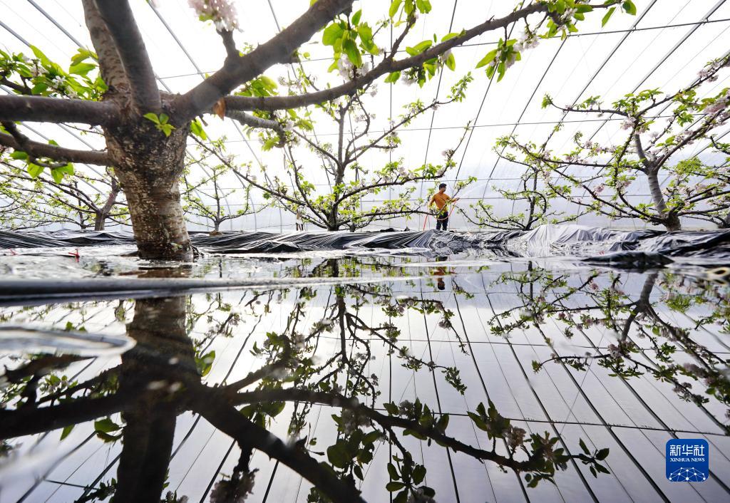 2022年1月11日,河北省灤州市茨榆坨鎮(zhèn)建民種植專業(yè)合作社的一名社員在大棚內(nèi)給櫻桃樹澆水。新華社記者 楊世堯 攝