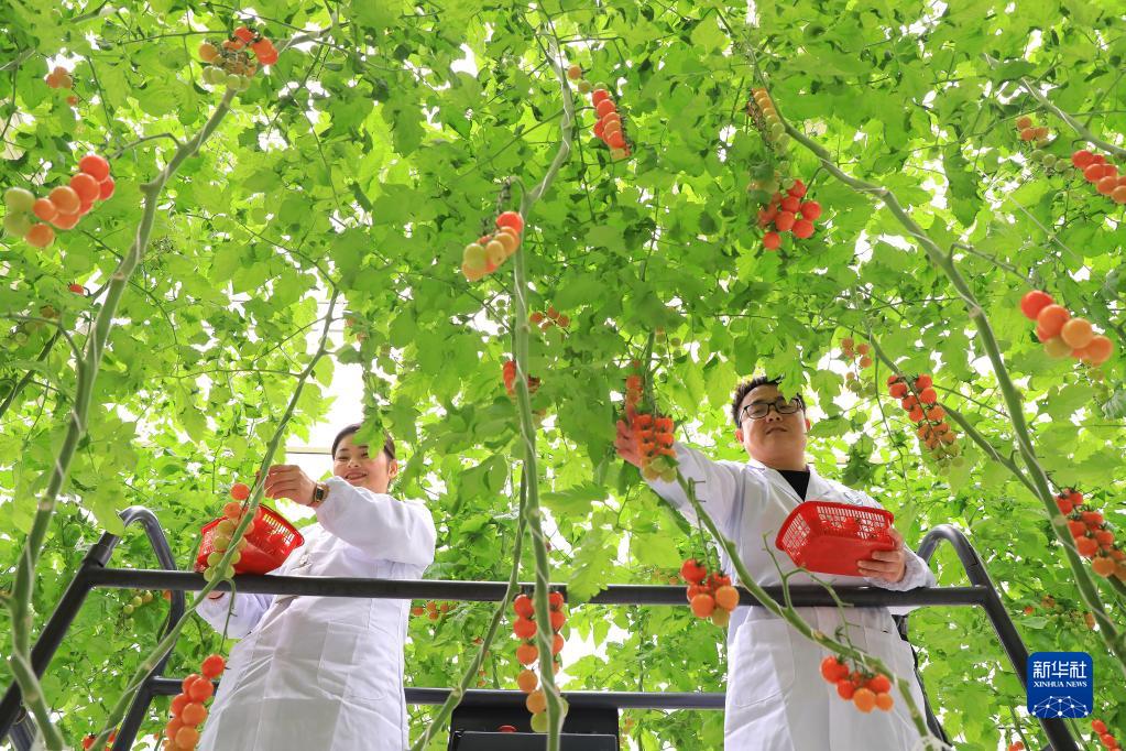 2022年2月18日,湖南省東安縣華維節(jié)水公司智慧農(nóng)業(yè)大棚內(nèi),員工們采摘圣女果準(zhǔn)備上市。新華社發(fā)(嚴(yán)潔攝)