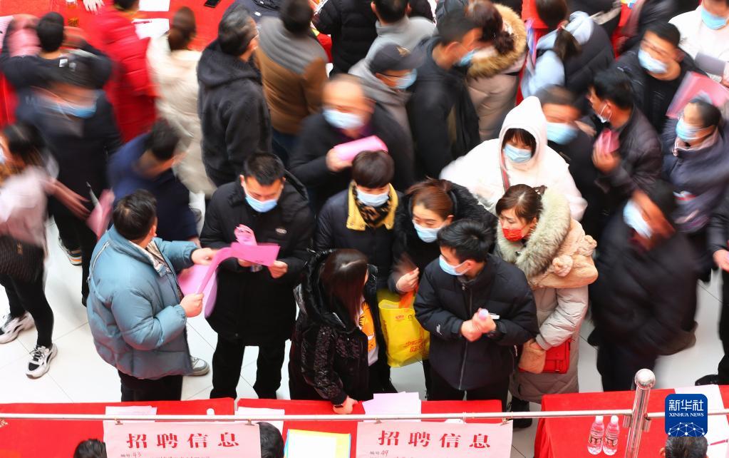 2022年2月19日,求職人員在山東省滕州市“春風(fēng)送崗”春季人才招聘會(huì)上尋找就業(yè)崗位。新華社發(fā)(李志軍攝)