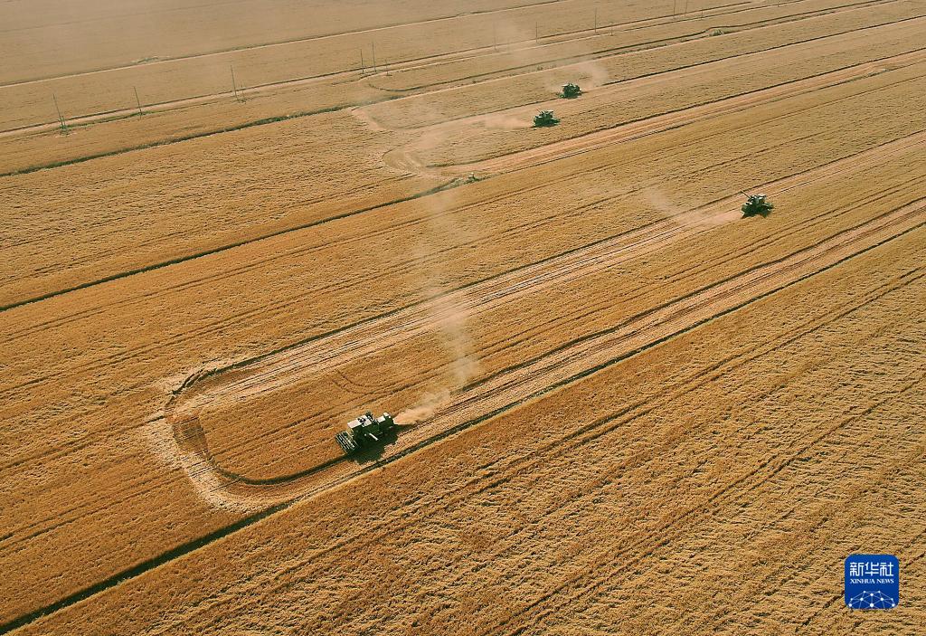 在河南省黃泛區(qū)農(nóng)場九分場的麥田里,農(nóng)機手操作收割機收獲小麥(2021年6月6日攝,無人機照片)。新華社記者 李安 攝