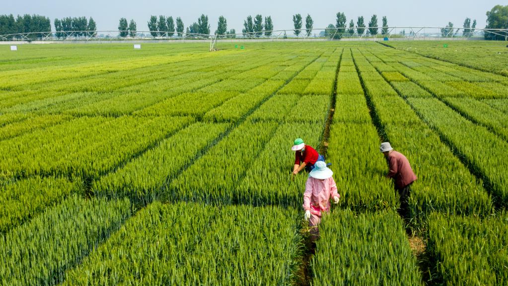 2021年5月12日,農(nóng)民在河北辛集市馬蘭農(nóng)場節(jié)水小麥田里勞作。(李秋華攝)