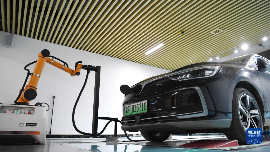 在雄安新區(qū)劇村變電站智慧充電區(qū),插拔槍機(jī)器人為一輛電動(dòng)汽車充電(3月18日攝)。新華社記者 朱旭東 攝