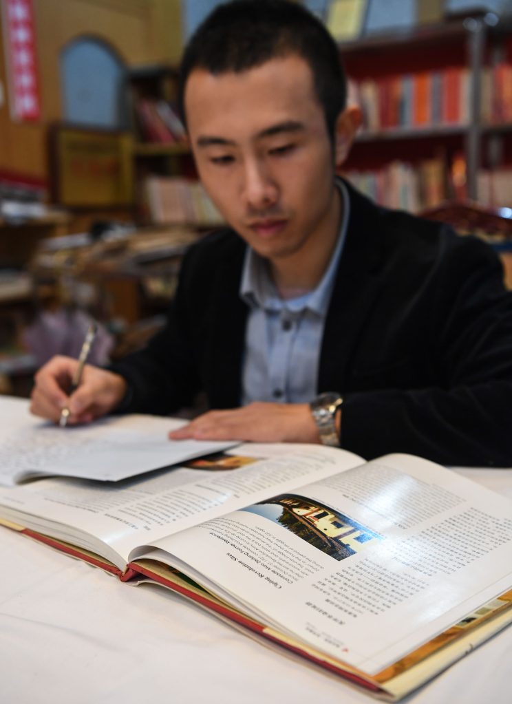 毛浩夫在研讀有關(guān)井岡山的英文資料,豐富英文講解素材。新華社記者申宏攝