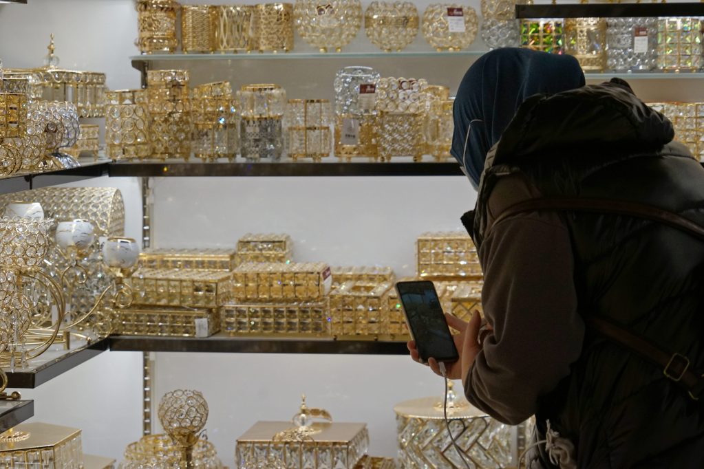 義烏國際商貿(mào)城一家水晶商鋪內(nèi),業(yè)務(wù)員小丁正在貨架前進(jìn)行遠(yuǎn)程視頻連線,手機(jī)的另一頭連著巴勒斯坦。受疫情影響,海外客商來華不便,遠(yuǎn)程直播成為其采購之“眼睛”?!翱蛻魮?dān)心這個燈臺尺寸比較大,運費會不會比較貴?”業(yè)務(wù)員小丁問?!皼]問題,主體和燈座可以拆卸,包裝不占空間?!鄙啼佖?fù)責(zé)人劉榮斌立即回復(fù)。