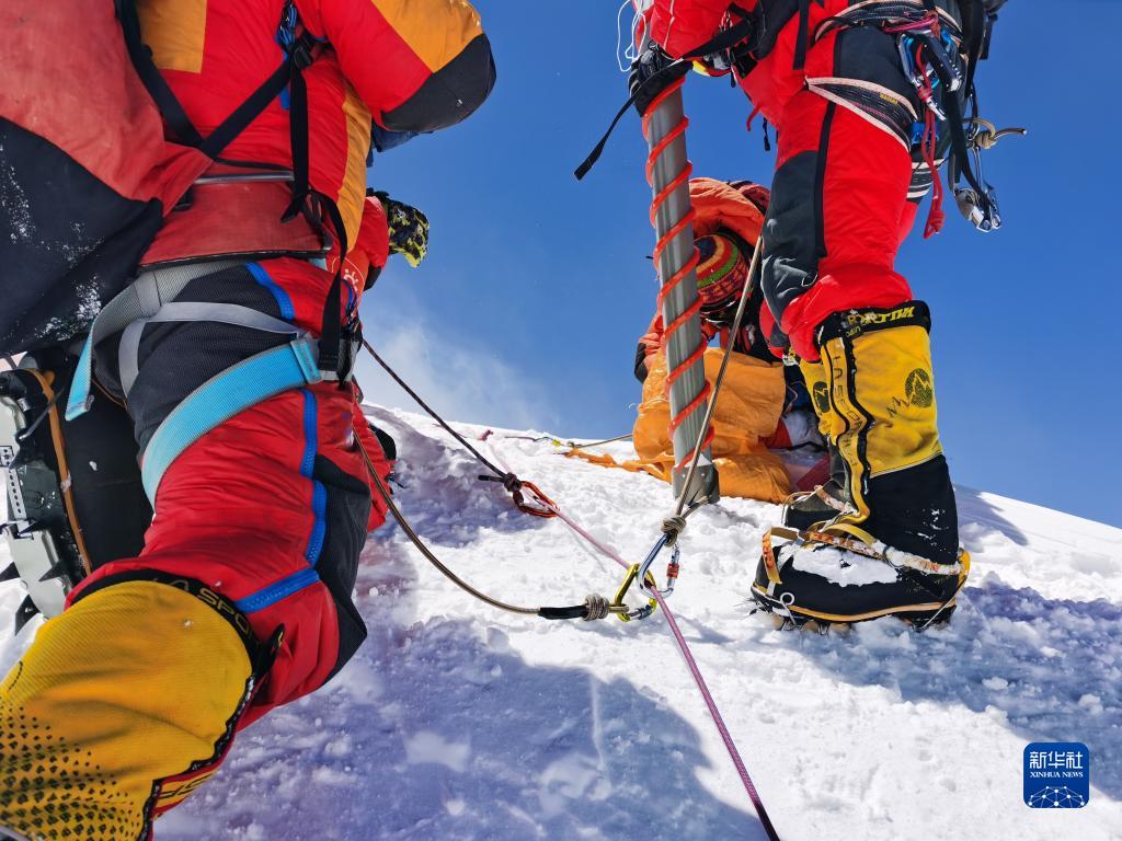5月4日,在珠穆朗瑪峰峰頂,科考隊(duì)員在采集冰雪樣品。新華社特約記者 索朗多吉 攝