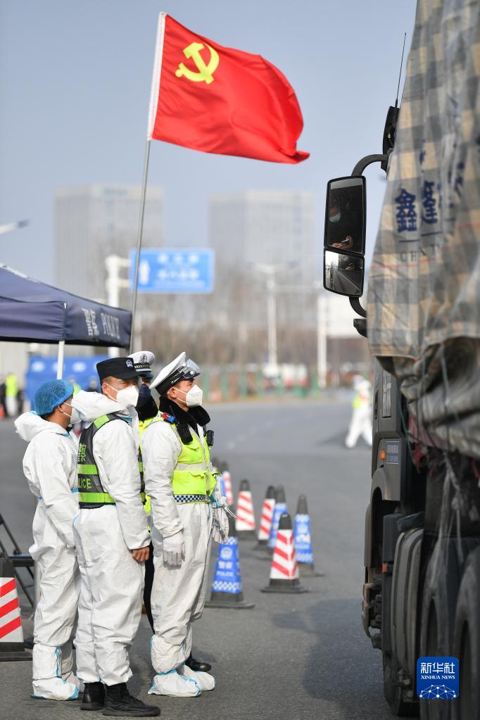 石家莊市公安局高新技術(shù)產(chǎn)業(yè)開發(fā)區(qū)公安分局民警在藁城區(qū)通往市區(qū)的路口執(zhí)勤(2021年1月10日攝)。當(dāng)日是首個“中國人民警察節(jié)”。新華社記者 楊世堯 攝