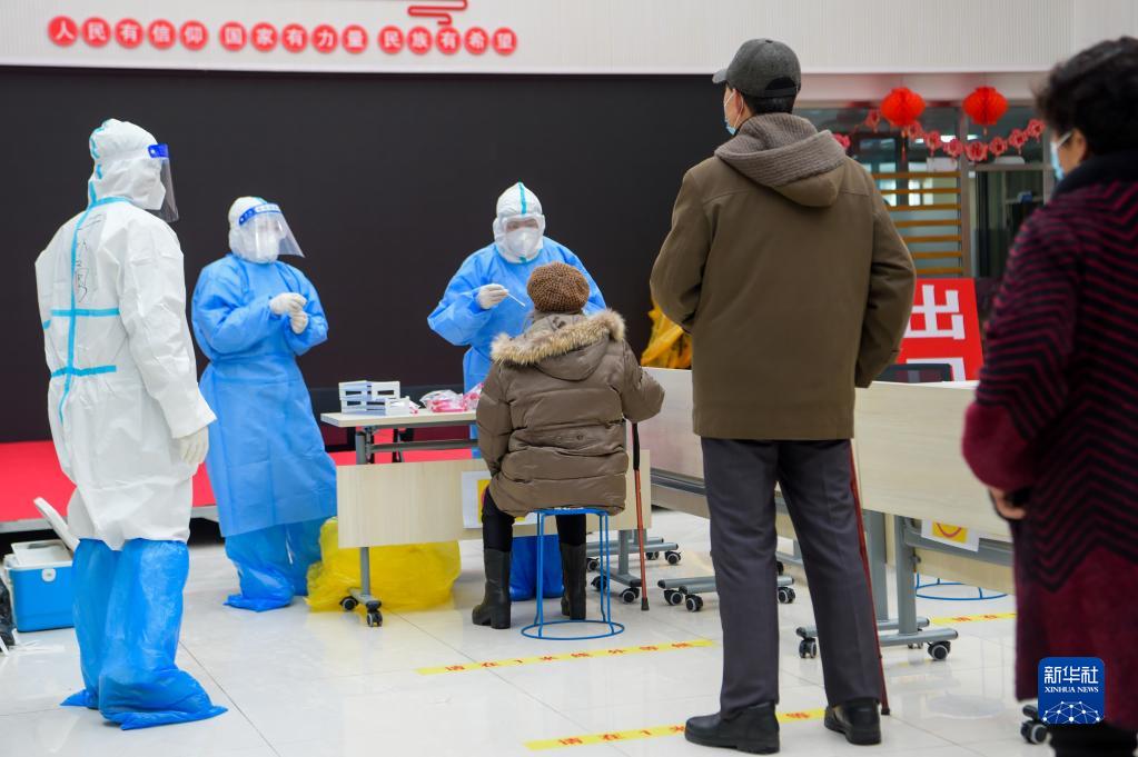 在內(nèi)蒙古滿洲里市東山街道辦事處怡園社區(qū)府欣小區(qū)A區(qū)核酸采樣點,工作人員為居民做核酸采樣(2021年11月29日攝)。新華社記者 李志鵬 攝