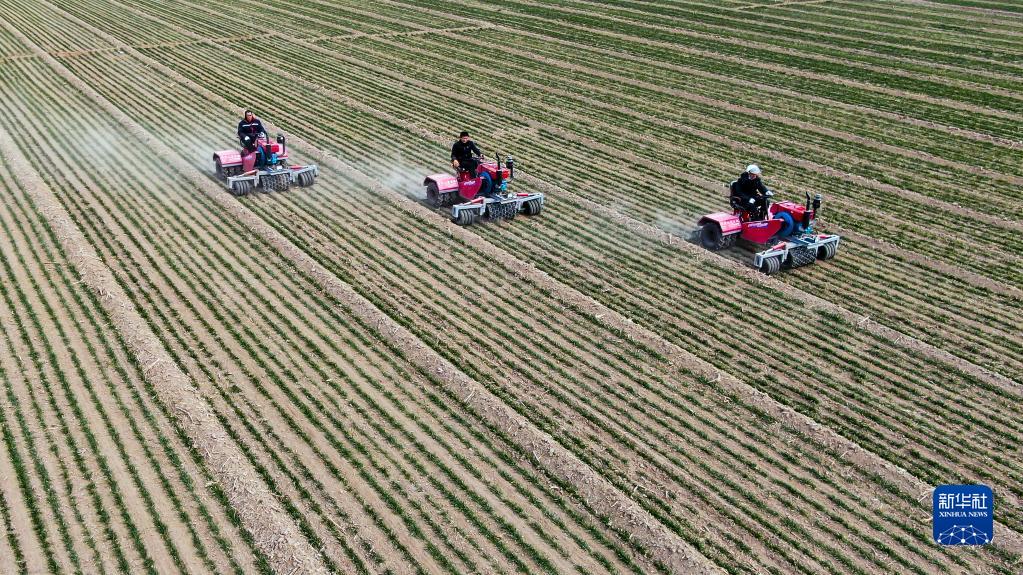 2月17日,在山東省聊城市莘縣妹冢鎮(zhèn),農(nóng)民在麥田里進行鎮(zhèn)壓保墑作業(yè)(無人機照片)。新華社記者 郭緒雷 攝