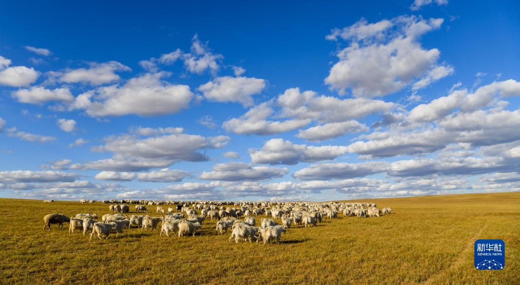 內(nèi)蒙古錫林浩特市寶力根蘇木上的羊群在覓食(2017年9月16日攝)。新華社記者 連振 攝