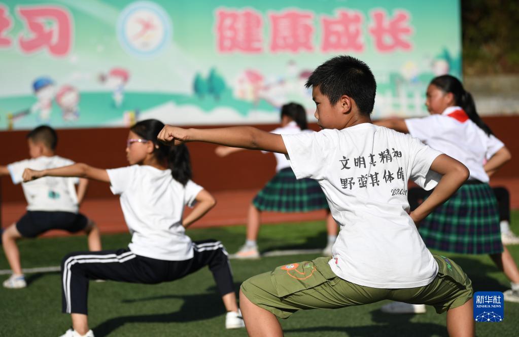 在陜西省安康市平利縣老縣鎮(zhèn)中心小學(xué)的操場上,學(xué)生們?cè)谡n后參加武術(shù)社團(tuán)活動(dòng)(2020年9月7日攝)。新華社記者 李一博 攝