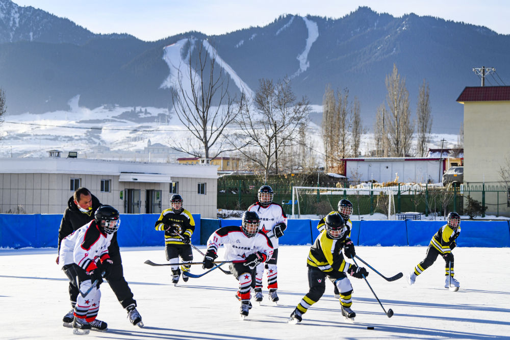 ↑新疆烏魯木齊市烏魯木齊縣第一中學小學部冰球隊的學生在進行冰球比賽(2022年1月12日攝)。