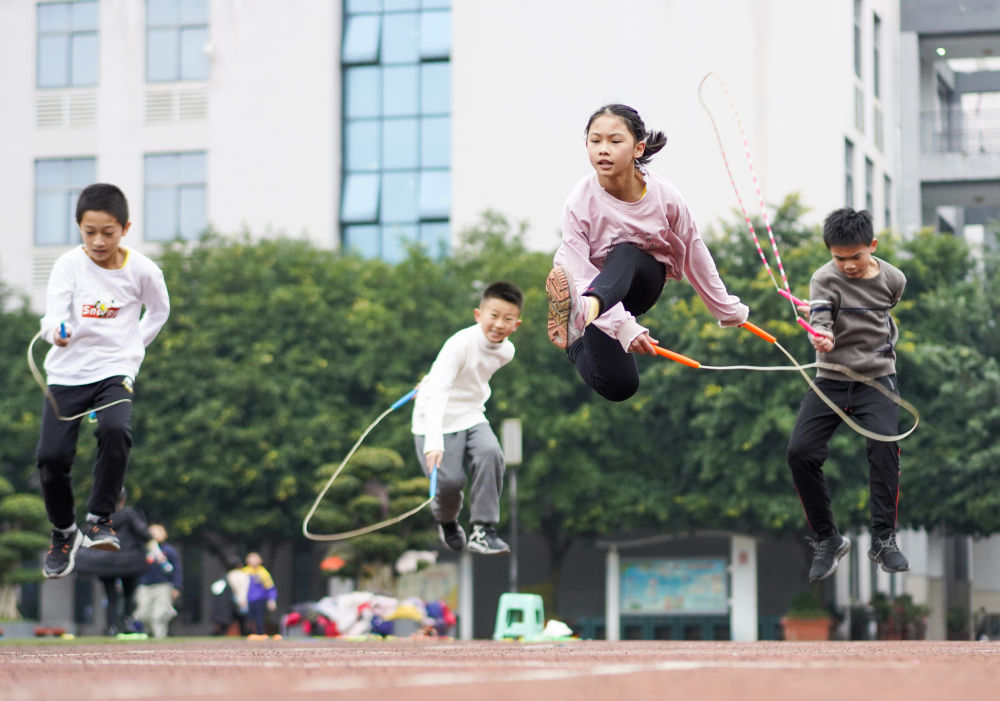 ↑重慶市九龍坡區(qū)西彭鎮(zhèn)第一小學校學生在體育課上進行花樣跳繩訓練(2020年12月9日攝)。