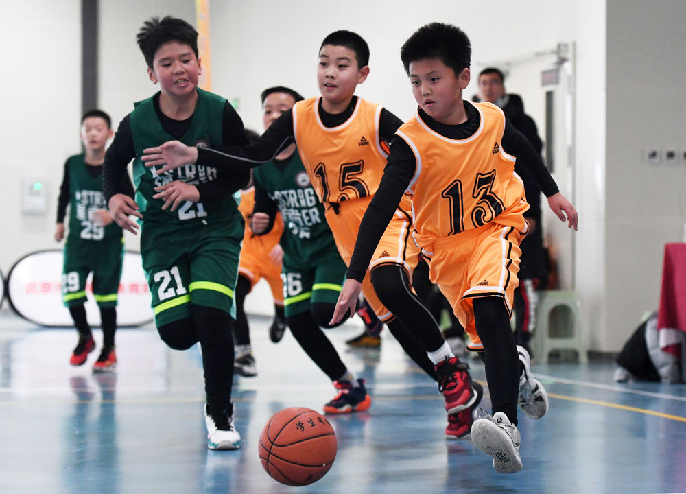 ↑懷柔區(qū)第三小學選手在2021年北京市第一屆小學生籃球比賽中帶球進攻(2021年12月11日攝)。