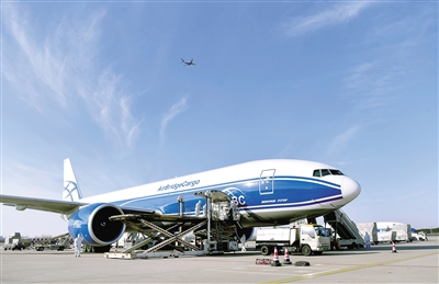 鄭州新鄭國際機場工作人員在為一架俄羅斯空橋貨運航空公司貨機裝貨 新華社發(fā)