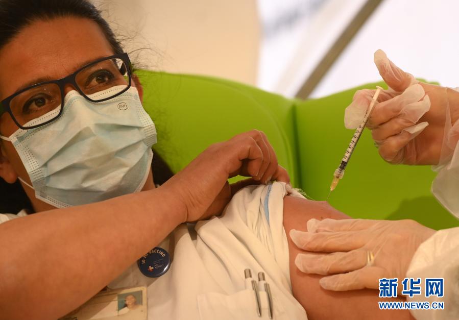 2020年12月28日,在意大利羅馬一家醫(yī)院,一名醫(yī)護人員接種由美國輝瑞制藥有限公司與德國生物新技術公司聯(lián)合研發(fā)的新冠疫苗。新華社發(fā)(阿爾貝托·林格利亞攝)