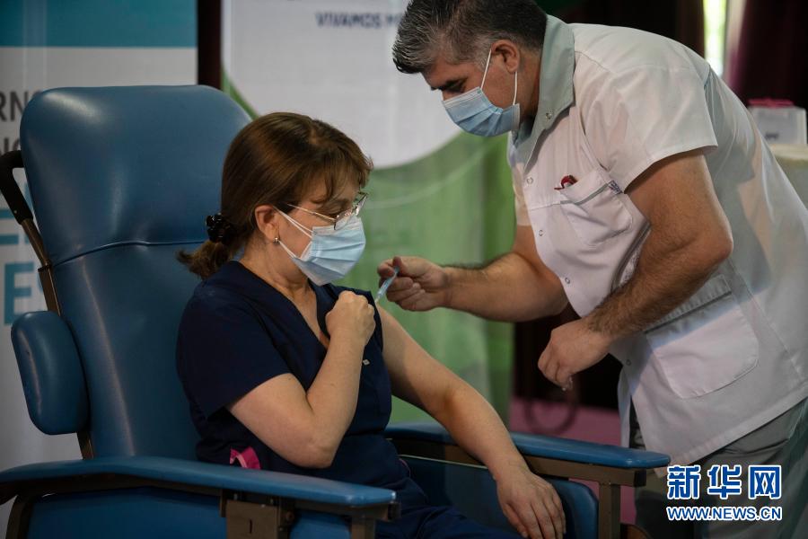 2020年12月29日,在阿根廷布宜諾斯艾利斯省阿維亞內(nèi)達,一名醫(yī)務人員接種由俄羅斯研發(fā)的“衛(wèi)星V”疫苗。新華社發(fā)(馬丁·薩巴拉攝)