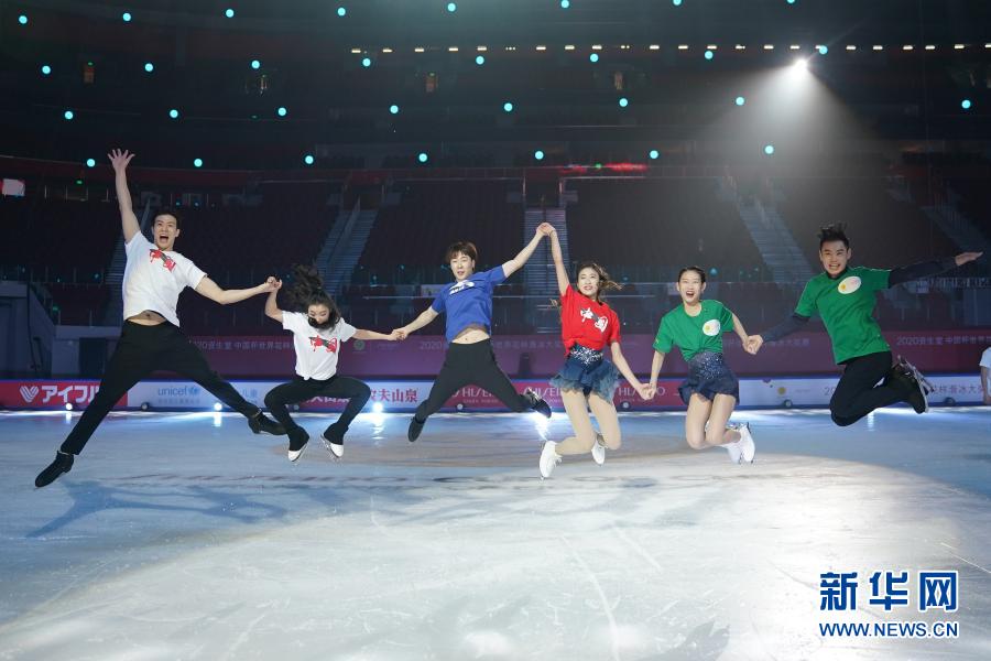 這是2020年11月8日,中國冰舞組合王詩玥(左二)/柳鑫宇(左一)、男單選手金博洋(左三)、女單選手陳虹伊(右三)、雙人滑組合彭程(右二)/金楊在2020中國杯世界花樣滑冰大獎(jiǎng)賽為觀眾表演后合影。新華社記者 鞠煥宗 攝
