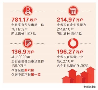 數(shù)據(jù)顯示,截至去年年底,全省實(shí)有各類市場主體781.17萬戶,同比增長11.93%。其中2020年全省新設(shè)各類市場主體136.9萬戶,居全國第6位、中部六省第1位。