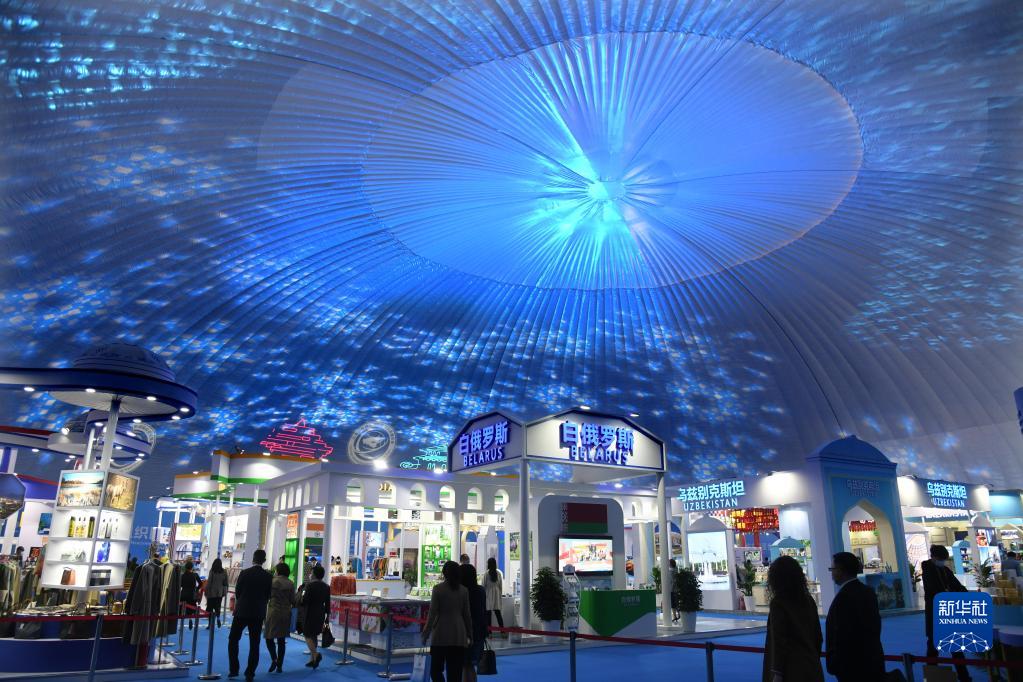 與會嘉賓在各國形象館展區(qū)參觀(2021年4月26日攝)。當(dāng)日,2021上海合作組織國際投資貿(mào)易博覽會暨上海合作組織地方經(jīng)貿(mào)合作青島論壇在青島開幕。新華社記者 李紫恒 攝