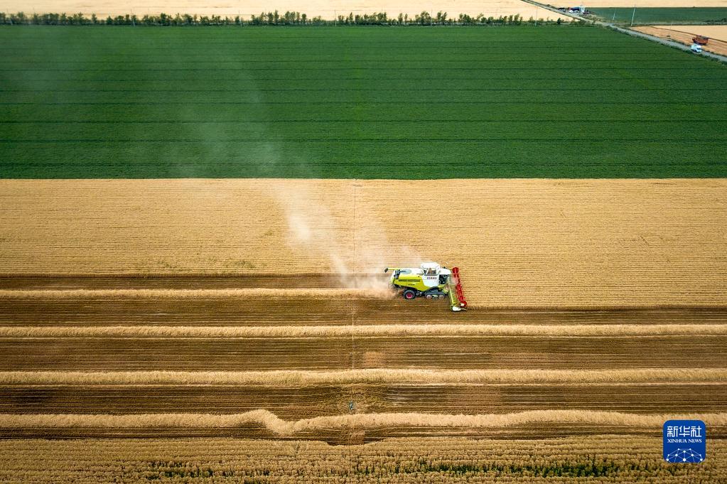 聯(lián)合收割機(jī)在新疆昌吉回族自治州奇臺(tái)縣大泉塔塔爾民族鄉(xiāng)的麥田里收割小麥(2022年7月7日攝,無人機(jī)照片)。新華社記者 張嘯誠 攝