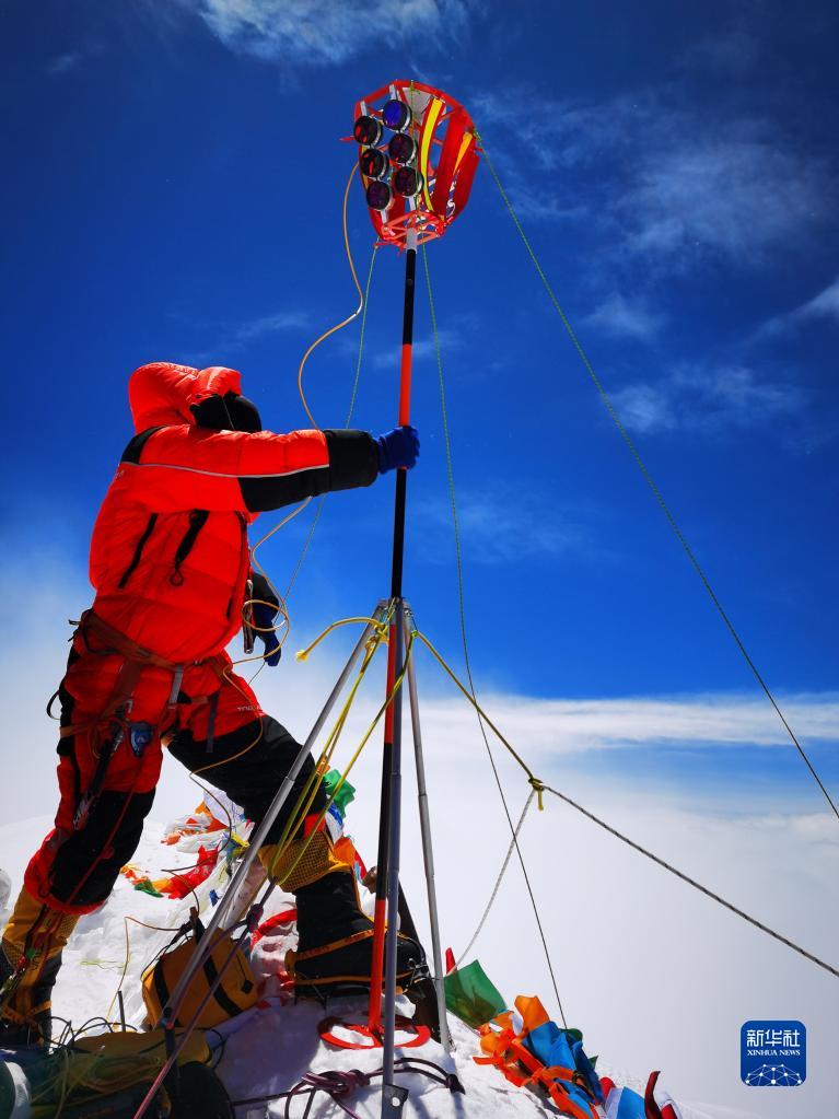 2020珠峰高程測(cè)量登山隊(duì)隊(duì)員在珠穆朗瑪峰峰頂開展測(cè)量工作(2020年5月27日攝)。新華社特約記者 扎西次仁 攝
