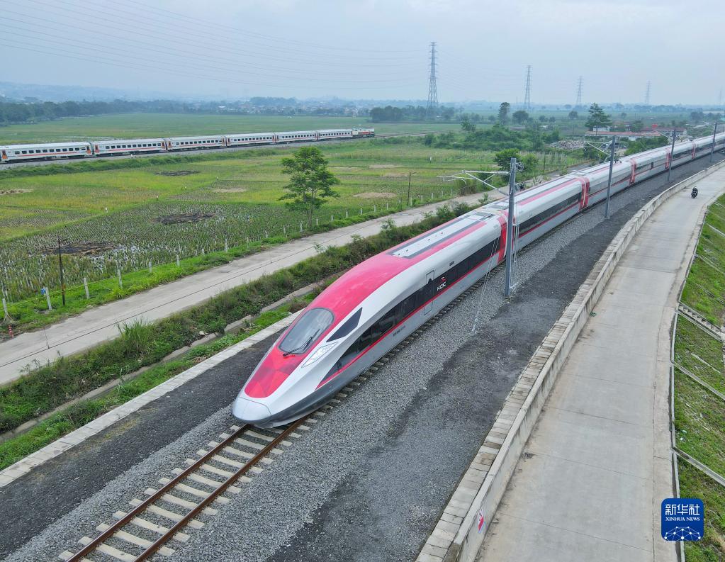 在印度尼西亞西爪哇省萬隆市,一列高鐵動車組正在雅萬高鐵試驗段進(jìn)行熱滑試驗(2022年11月9日攝,無人機照片)。新華社發(fā)(李培養(yǎng)攝)