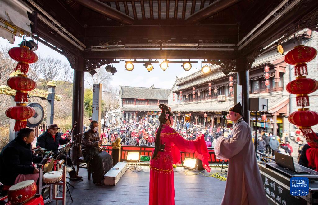 江蘇省泰州市海陵區(qū)小鷹揚劇團在泰州老街古戲臺表演揚劇《珍珠塔·贈塔》選段(1月24日攝)。新華社發(fā)(湯德宏 攝)