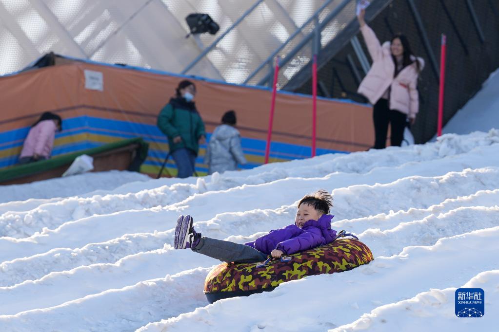 在黑龍江哈爾濱,零下十幾攝氏度的室外溫度阻擋不了人們?cè)诒獾乃苫ń贤嫜┑仫L(fēng)箏、冰球、雪地自行車、冰雪滑道等項(xiàng)目。