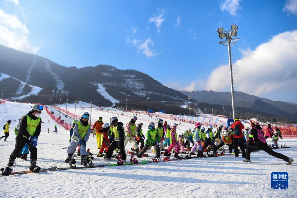 2023年1月11日,滑雪冬令營(yíng)學(xué)員在陜西太白鰲山滑雪度假區(qū)教練的帶領(lǐng)下熱身。新華社發(fā)(鄒競(jìng)一攝)