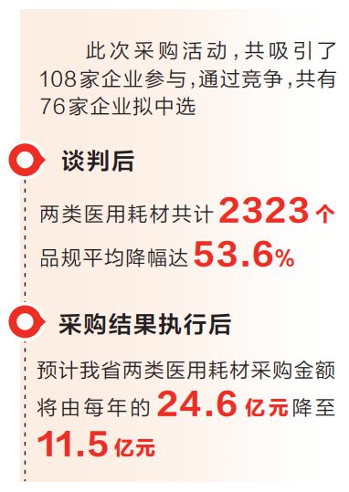此次采購(gòu)活動(dòng),共吸引了108家企業(yè)參與,其中,國(guó)內(nèi)企業(yè)70家、外資企業(yè)38家。通過(guò)前期充分調(diào)研,會(huì)中集中開(kāi)標(biāo)、兩輪談判等公平競(jìng)爭(zhēng)環(huán)節(jié),共有76家企業(yè)擬中選。談判后,兩類醫(yī)用耗材共計(jì)2323個(gè)品規(guī)平均降幅達(dá)53.6%。采購(gòu)結(jié)果執(zhí)行后,預(yù)計(jì)我省兩類醫(yī)用耗材采購(gòu)金額將由每年的24.6億元降至11.5億元。