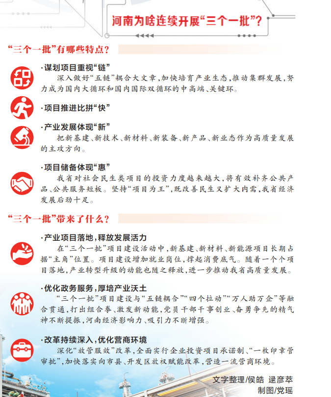 抓項目就是抓發(fā)展,謀項目就是謀未來。我省堅持項目為王理念,舉行第八期“三個一批”項目建設(shè)活動,又一批含新量、含綠量、含金量高的項目簽約、開工、投產(chǎn),項目建設(shè)再掀熱潮,各地點燃高質(zhì)量發(fā)展“強引擎”。