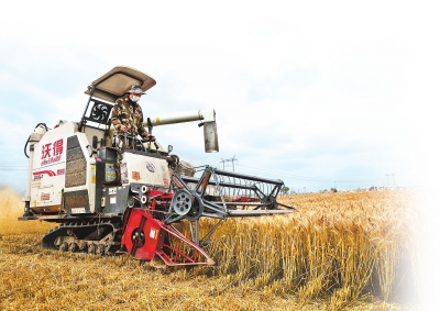 5月30日,鄧州市穰東鎮(zhèn)劉順雨村,農(nóng)機(jī)手操作履帶式聯(lián)合收割機(jī)搶收小麥。 本報(bào)記者 王錚 攝