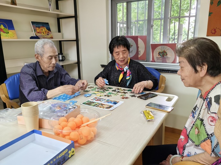 5月27日,上海市普陀區(qū)真如鎮(zhèn)街道一家老年人日間照料中心內(nèi),老人們正在玩拼圖游戲。新華社記者吳振東 攝