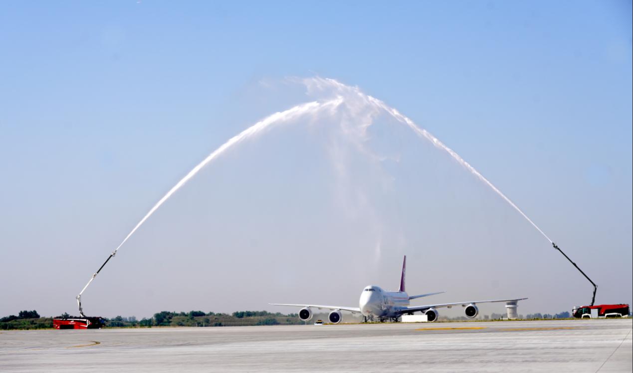 盧森堡貨航“鄭盧空中絲綢之路號(hào)”接受民航界最高禮儀“水門”的歡迎。姚自力攝