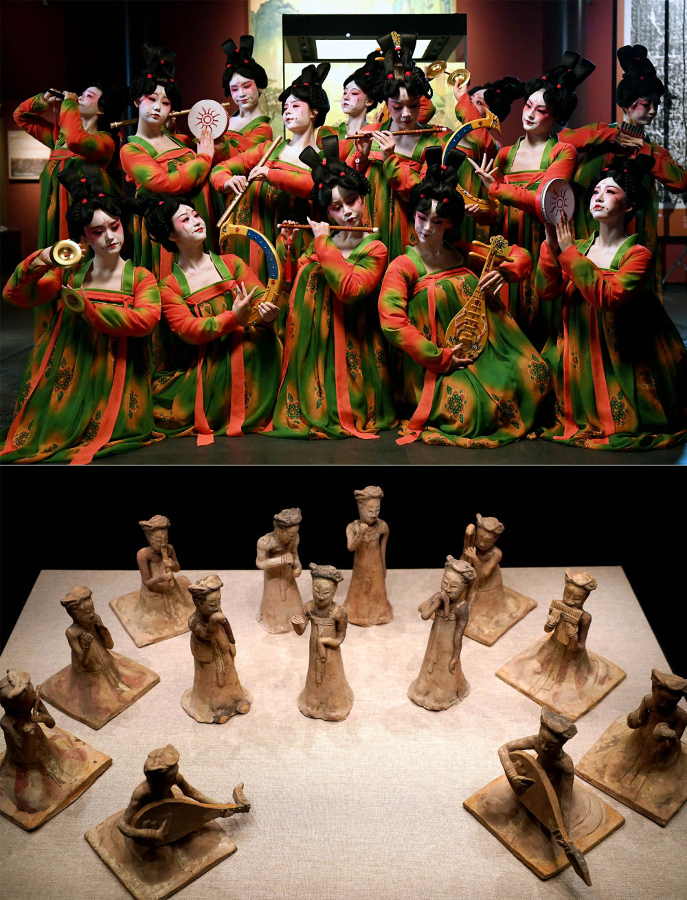 這是一張拼版照片:上圖為鄭州歌舞劇院的演員在錄制河南博物院元宵奇妙夜節(jié)目(2021年2月20日攝);下圖為河南博物院主展館內(nèi)展出的展品(2020年9月24日攝)。新華社記者 李安 攝