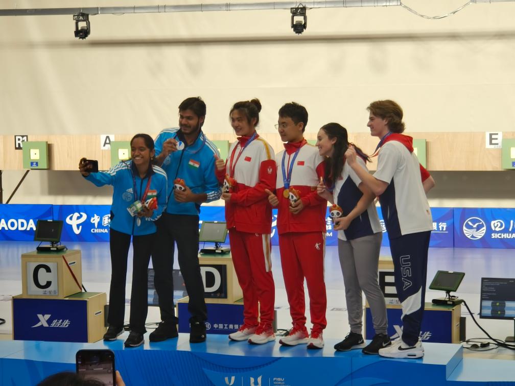 當(dāng)天,射擊賽場的頒獎儀式現(xiàn)場變成了全場一起慶生的歡樂景象。在10米氣步槍混合團(tuán)體項目獲得銀牌的印度姑娘瓦拉里萬站在領(lǐng)獎臺上,在“生日快樂”的祝福聲中,伴著現(xiàn)場觀眾的掌聲,與一同參加頒獎儀式的中國、美國選手們拍照留念。