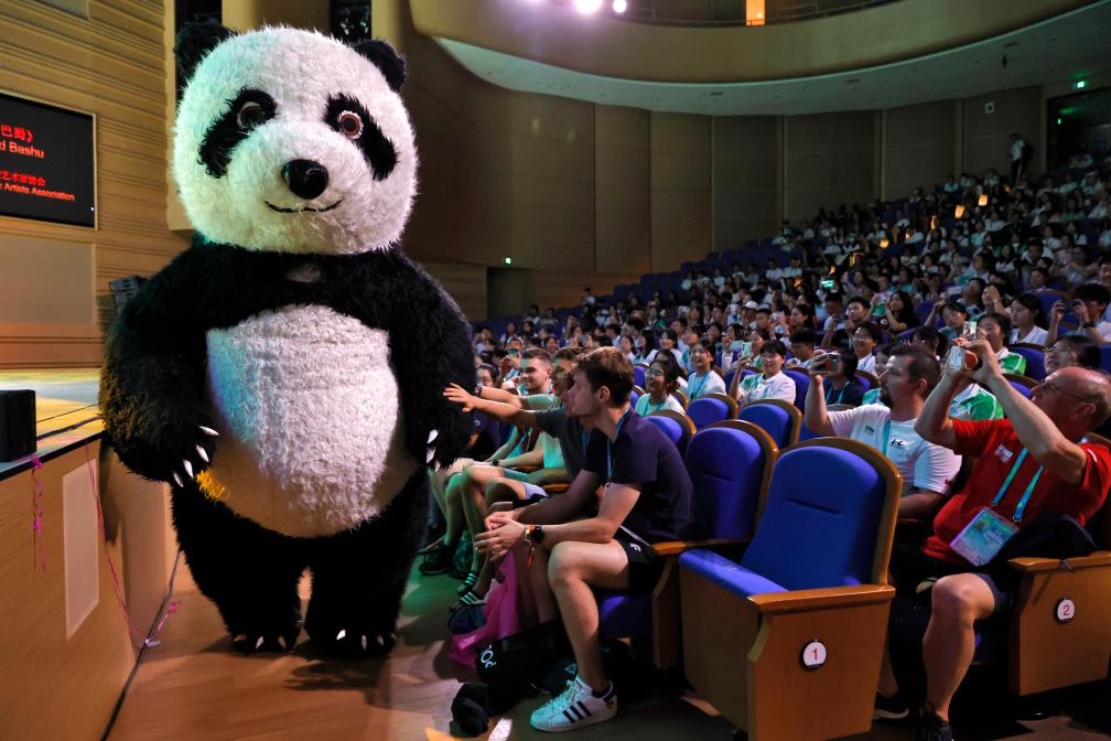 8月2日,一名演員裝扮成大熊貓在演出間隙與觀眾互動。當(dāng)日,“奇幻之夜”雜技魔術(shù)晚會在成都大運村藝術(shù)中心大劇場舉行。本場活動是在大運村舉辦的“Be Together”主題系列晚會之一。新華社記者沈伯韓攝