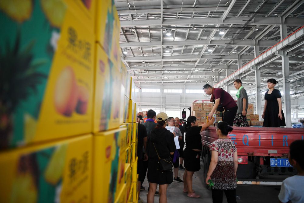 工作人員和志愿者在河北省涿州市鋼研物資儲(chǔ)備點(diǎn)內(nèi)將捐贈(zèng)物資裝車外運(yùn)(8月5日攝)。新華社記者 牟宇 攝