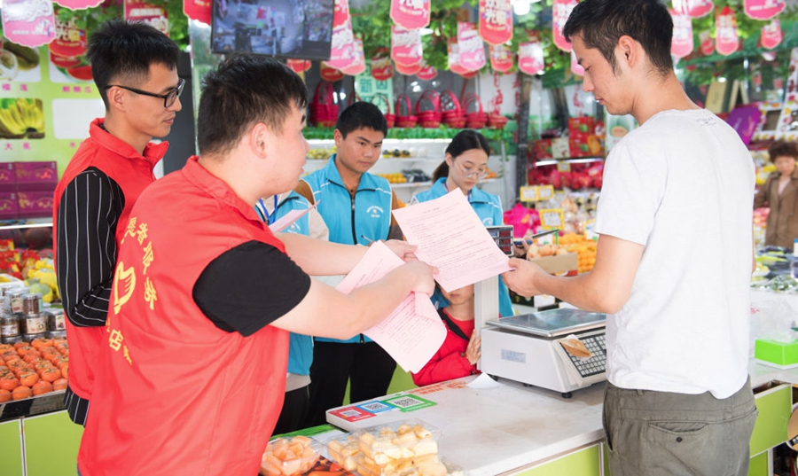 浙江省湖州市吳興區(qū)八里店鎮(zhèn)結合主題教育和“三服務”,推進“民生大走訪”工作機制,全體網(wǎng)格員下沉村、社一線,了解社情民意,化解矛盾糾紛,服務村社群眾。這是八里店鎮(zhèn)中心片區(qū)網(wǎng)格員(藍衣者)和志愿者(紅衣者)對一家店鋪進行平安問卷調(diào)查(2019年10月31日攝)。新華社記者 翁忻旸 攝