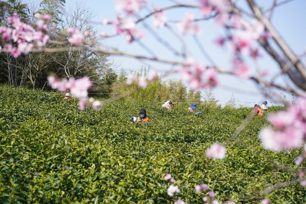 2022年3月29日,采茶人員在黃龍峴茶園采摘鮮葉。