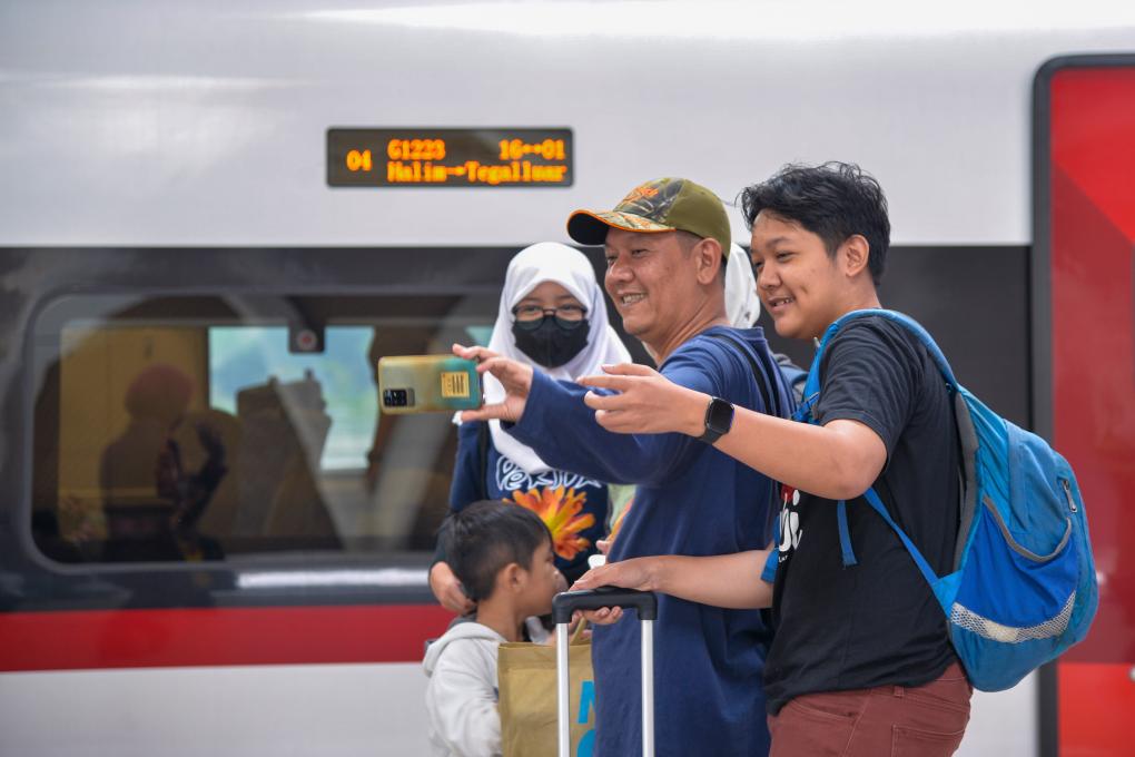 2023年12月25日,乘客在印度尼西亞雅加達的哈利姆車站站臺與雅萬高鐵高速動車組合影。截至12月24日,作為中印尼共建“一帶一路”合作的“金字招牌”,雅萬高鐵累計發(fā)送旅客突破100萬人次。