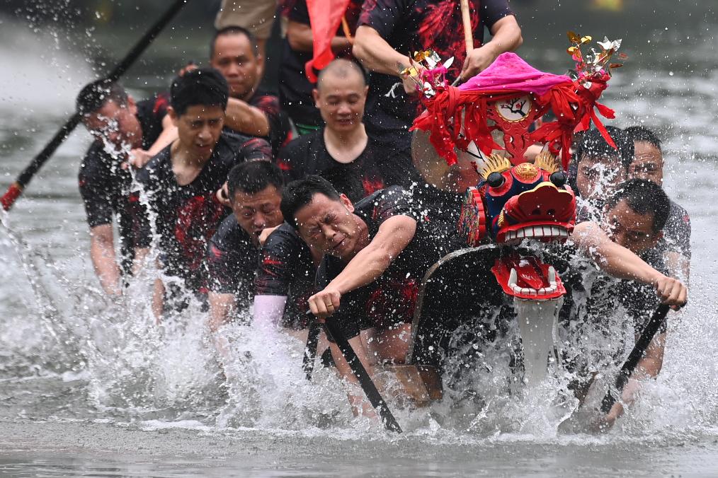 ??2023年6月22日,農歷五月初五,中國傳統(tǒng)節(jié)日端午節(jié),村民在杭州西溪國家濕地公園的蔣村龍舟勝會上劃龍舟。蔣村龍舟勝會于2011年被列入國家級非物質文化遺產名錄。新華社記者 黃宗治 攝