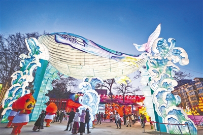 ??經(jīng)過快捷有序安檢,游客魚貫而入。這里不僅有金黃銀杏葉組成的“姓氏起源”樹,還有巨大鯨魚與藍色波浪融為一體的“海晏河清”燈組。記者從現(xiàn)場了解到,“鯨魚”正下方就是主會場,不定時會有各種節(jié)目表演來充當氛圍組。不一會兒,憨態(tài)可掬的“祝融熊貓”、悠揚動聽的民族樂器、精彩絕倫的“木偶變臉”就在這兒輪番上演,引得圍觀人群歡呼連連。
