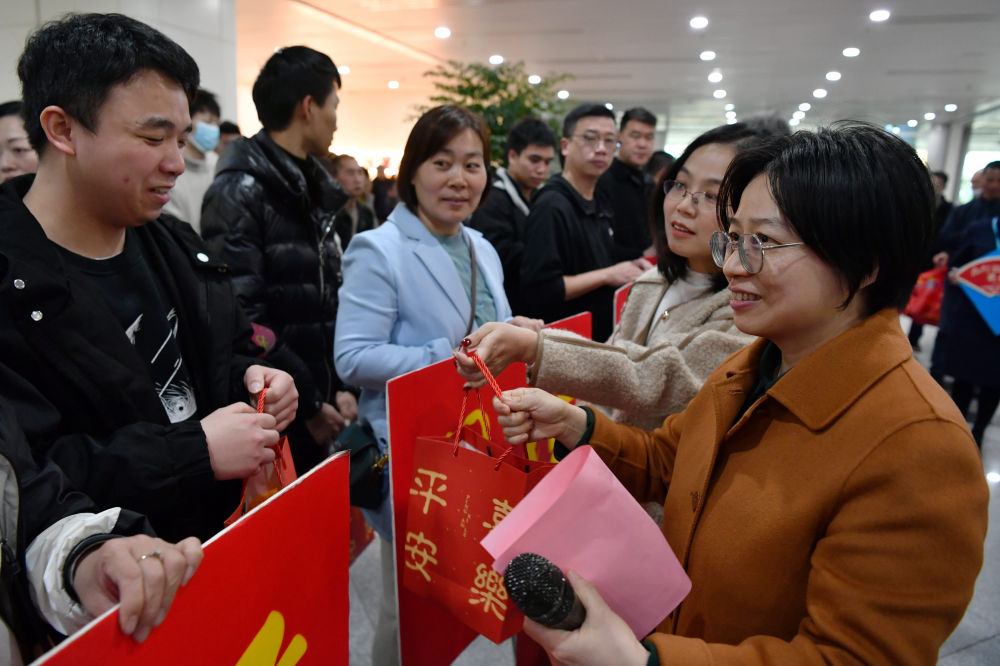 2024年2月15日,福州市人社部門(mén)工作人員(前右)向乘坐包機(jī)抵榕的返崗務(wù)工人員送上新春大禮包。當(dāng)日,來(lái)自云南、貴州的364名返崗務(wù)工人員乘坐的飛機(jī)降落在福州長(zhǎng)樂(lè)國(guó)際機(jī)場(chǎng)。這是2024年春節(jié)后福州市人社部門(mén)通過(guò)免費(fèi)包機(jī)接回的首批重點(diǎn)企業(yè)返崗務(wù)工人員。新華社記者 魏培全 攝