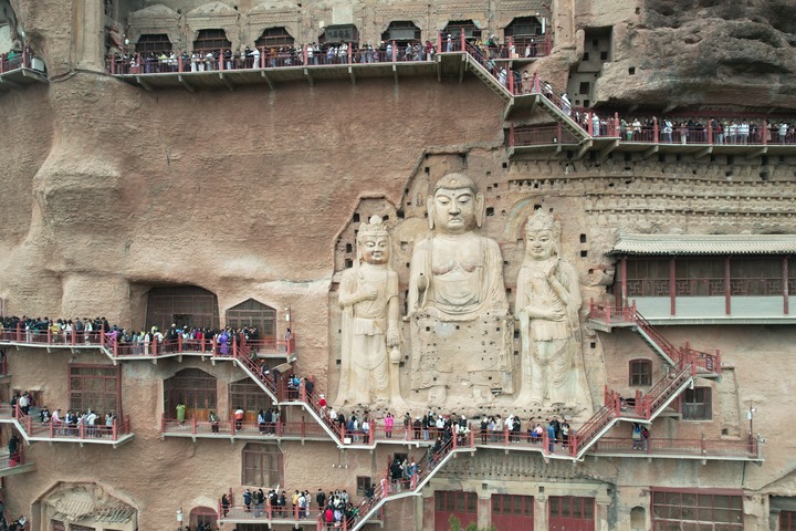 ??4月5日,游客在位于天水市麥積區(qū)的麥積山石窟游覽(無人機(jī)照片)。 新華社記者 張智敏 攝