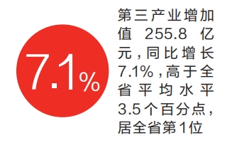 ??分產(chǎn)業(yè)看,三次產(chǎn)業(yè)增加值增速全面領(lǐng)先。第一產(chǎn)業(yè)增加值18.4億元,同比增長2.9%,高于全省平均水平0.3個百分點,居全省第4位;第二產(chǎn)業(yè)增加值189.2億元,同比增長11.7%,高于全省平均水平5個百分點,居全省第2位;第三產(chǎn)業(yè)增加值255.8億元,同比增長7.1%,高于全省平均水平3.5個百分點,居全省第1位。(記者 李宗寬)