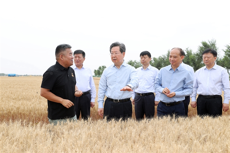 長葛市石象鎮(zhèn)的高標準農(nóng)田里,金色的麥浪起伏蕩漾,聯(lián)合收割機穿梭奔忙,一派燦爛豐盈的喜人景象。樓陽生走進麥田、揉開麥穗,察看麥粒飽滿程度,與農(nóng)戶、農(nóng)機手親切交流,了解播種面積、麥收進度、收成收入等。他指出,春爭日、夏爭時,要密切關(guān)注天氣變化,搶抓麥收有利窗口期,加強跨區(qū)機收組織調(diào)度,提升機械化、智能化水平,確保應(yīng)收盡收、顆粒歸倉。在河南鼎優(yōu)農(nóng)業(yè)科技有限公司,樓陽生走進新品種展示中心,了解玉米、瓜果、蔬菜等新品種培育種植情況,鼓勵企業(yè)不僅要培優(yōu)種好新品種,還要往深加工走,拉長產(chǎn)業(yè)鏈、提高附加值。在聽取企業(yè)人才引育情況匯報后,他指出,發(fā)展現(xiàn)代農(nóng)業(yè)離不開一支高素質(zhì)農(nóng)業(yè)從業(yè)者隊伍,要加強產(chǎn)業(yè)扶持、政策支持,培育引導(dǎo)更多愛農(nóng)業(yè)、有知識、懂技術(shù)、善經(jīng)營的新農(nóng)人,投身農(nóng)村廣闊天地大展身手。